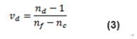玻璃的另一種材料屬性是色散系數(shù),用于量化玻璃呈現(xiàn)的色散量。它是材料在f (486.1nm)、d (587.6nm) 和c (656.3nm)波長時的折射率(方程式3)。