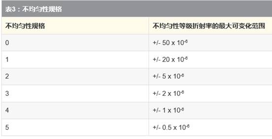 某種介質(zhì)的折射率是指光在真空中的速度與光在介質(zhì)中的速度之比。玻璃的折射率范圍一般在1.4-4.0之間,與針對紅外線優(yōu)化的玻璃相比,可視玻璃的折射率范圍要小一些。例如,N-BK7(一種通用的可視玻璃)的折射率為1.517,然而(一種通用的紅外玻璃)的折射率為4.003。有關(guān)紅外材料的更多信息,請參閱“紅外 (IR) 應用領(lǐng)域使用的正確材料”。光學玻璃的折射率是一種重要屬性,因為光學表面的功率是從表面的曲率半徑和表面任意一側(cè)上的介質(zhì)折射率之差得來的。玻璃制造商指定的不均勻性是指玻璃折射率的變化。不均勻性是根據(jù)不同的等級來指定的,其中等級和不均勻性是互為相反關(guān)系的,隨著等級的增加,不均勻性則會減少(表3)。