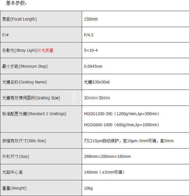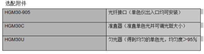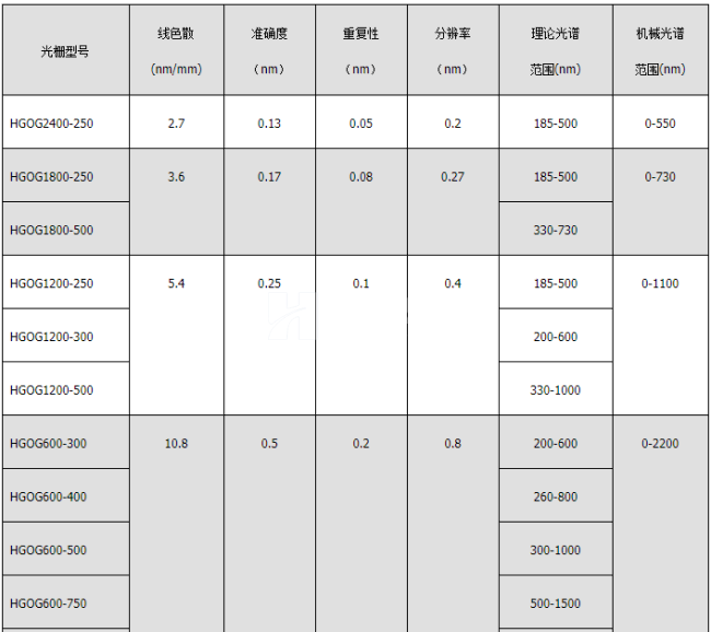 HGISW / HGISU系列單色儀/光譜儀光柵與技術(shù)指標(biāo)對照表