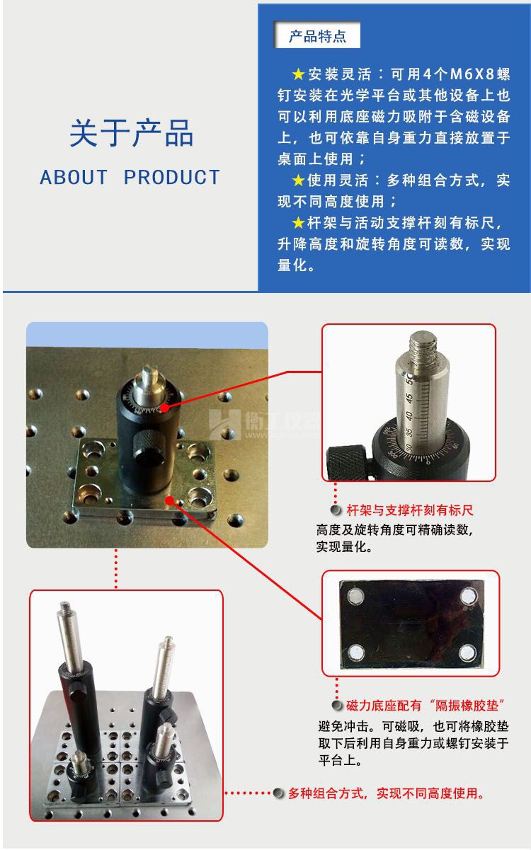 本產(chǎn)品安裝靈活,使用靈活,桿架與活動支撐桿刻有標(biāo)尺,升降高度和旋轉(zhuǎn)角度可讀數(shù),實(shí)現(xiàn)量化。