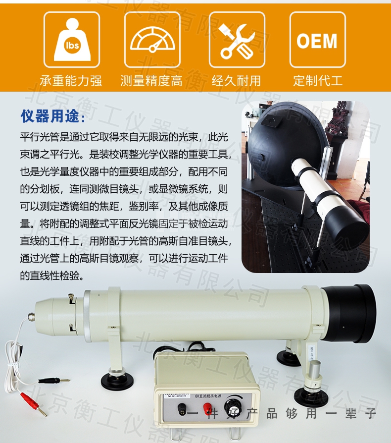 要工具,也是光學量度儀器中的重要組成部分,配用不同的分劃板,連同測微目鏡頭,或顯微鏡系統(tǒng),則可以測定透鏡組的焦距,鑒別率,及其他成像質量。將附配的調(diào)整式平面反光鏡。固定于被檢運動直線的工件上,用附配于光管的高斯自準目鏡頭,通過光管上的高斯目鏡觀察,可以進行運動工件的直線型檢驗。