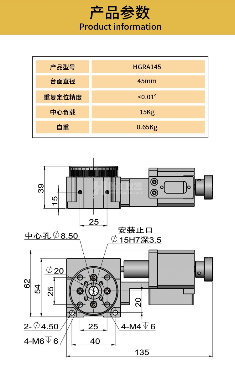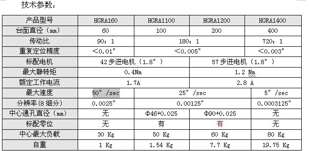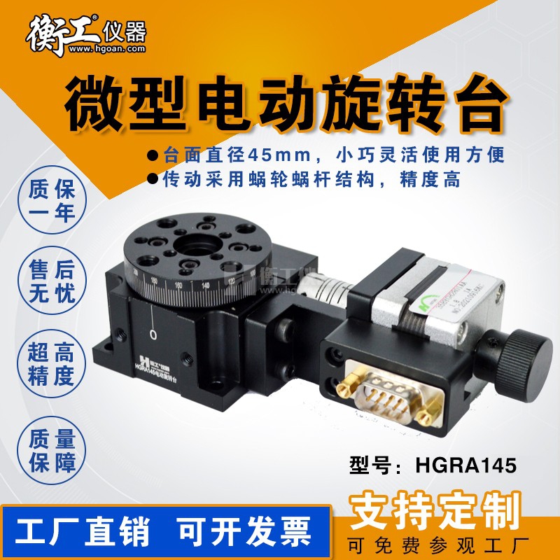 HGRA1系列 渦輪電動旋轉臺,標準配備有步進電機和標準RS232接口,可增加光電零位,配合HGC系列運動控制器可實現(xiàn)自動控制旋轉軸系采用軸承鋼材料精密加工而成,配合精度高,承載大,壽命長傳動采用蝸輪蝸桿結構,臺面可以任意正反旋轉蝸輪蝸桿經(jīng)過精密研配,運動舒適,空回極小。