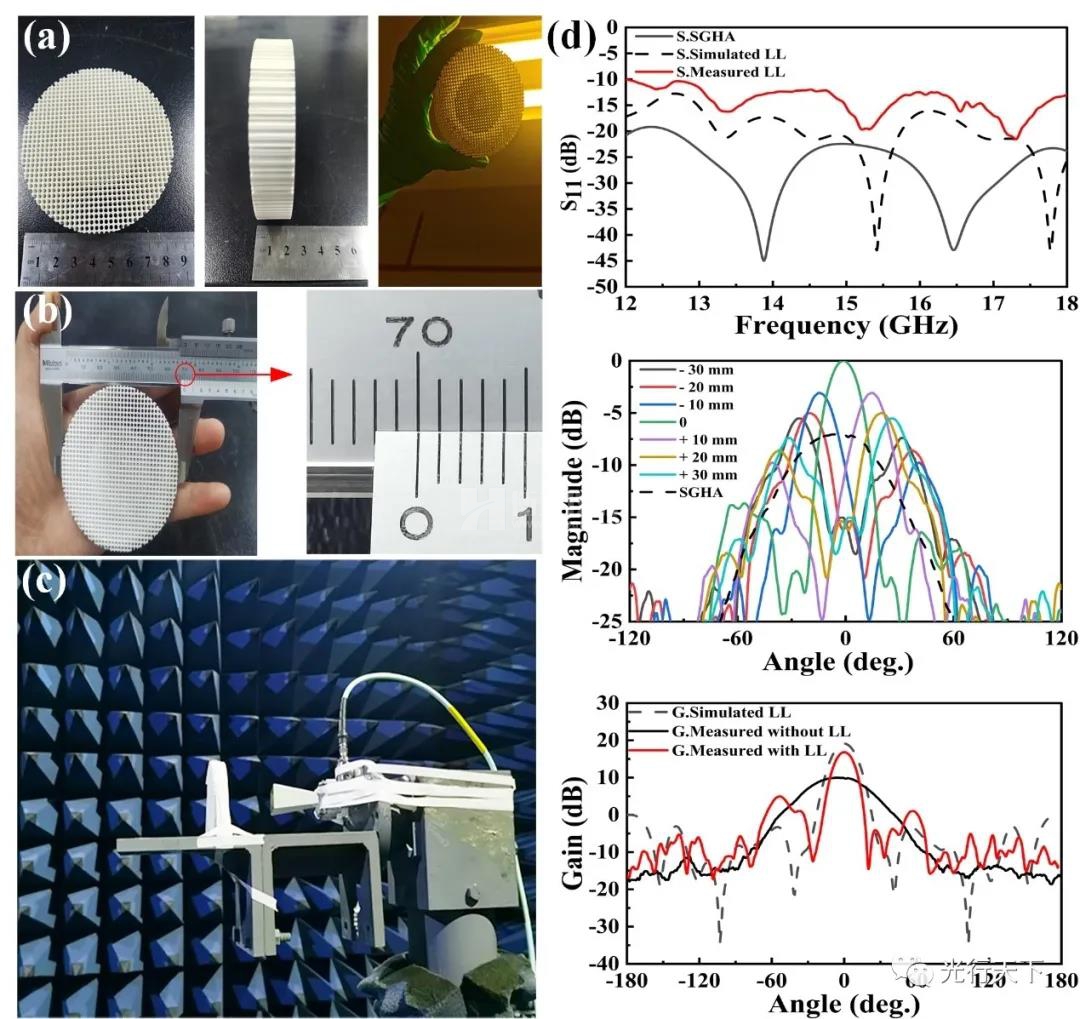 本論文通過引入超材料結(jié)構(gòu),實現(xiàn)了高介電常數(shù)陶瓷介質(zhì)的梯度分布,并結(jié)合轉(zhuǎn)換光學(xué)理論,采用SLA紫外光固化3D打印工藝制備,制備獲得了一種低剖面結(jié)構(gòu)的龍勃透鏡。該透鏡天線燒結(jié)溫度低(850°C燒結(jié)成型)、成型精度高(凈尺寸與設(shè)計尺寸幾乎一致)、厚度薄(約10mm),在Ku波段實現(xiàn)了±15°的波束掃描,對饋源的增益提升超過5 dBi。該工作為復(fù)雜結(jié)構(gòu)微波/射頻器件一體化成型提供了新思路,有利于推進低成本陶瓷微波/射頻組件的開發(fā)與制備。