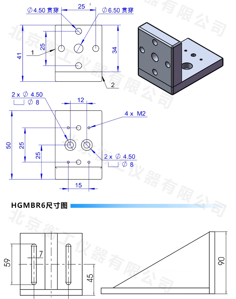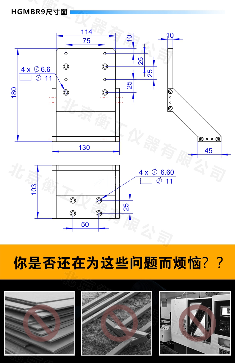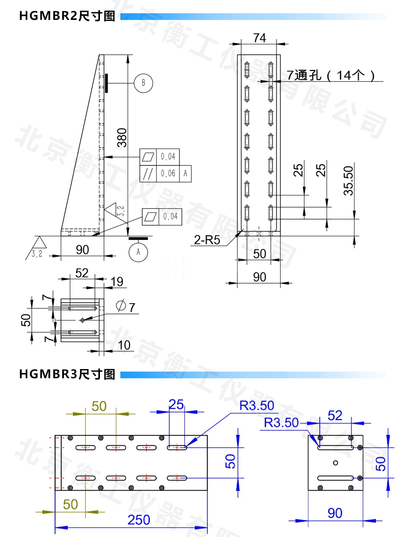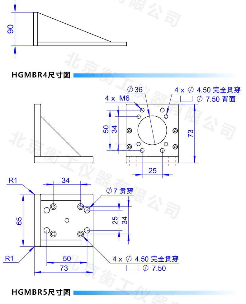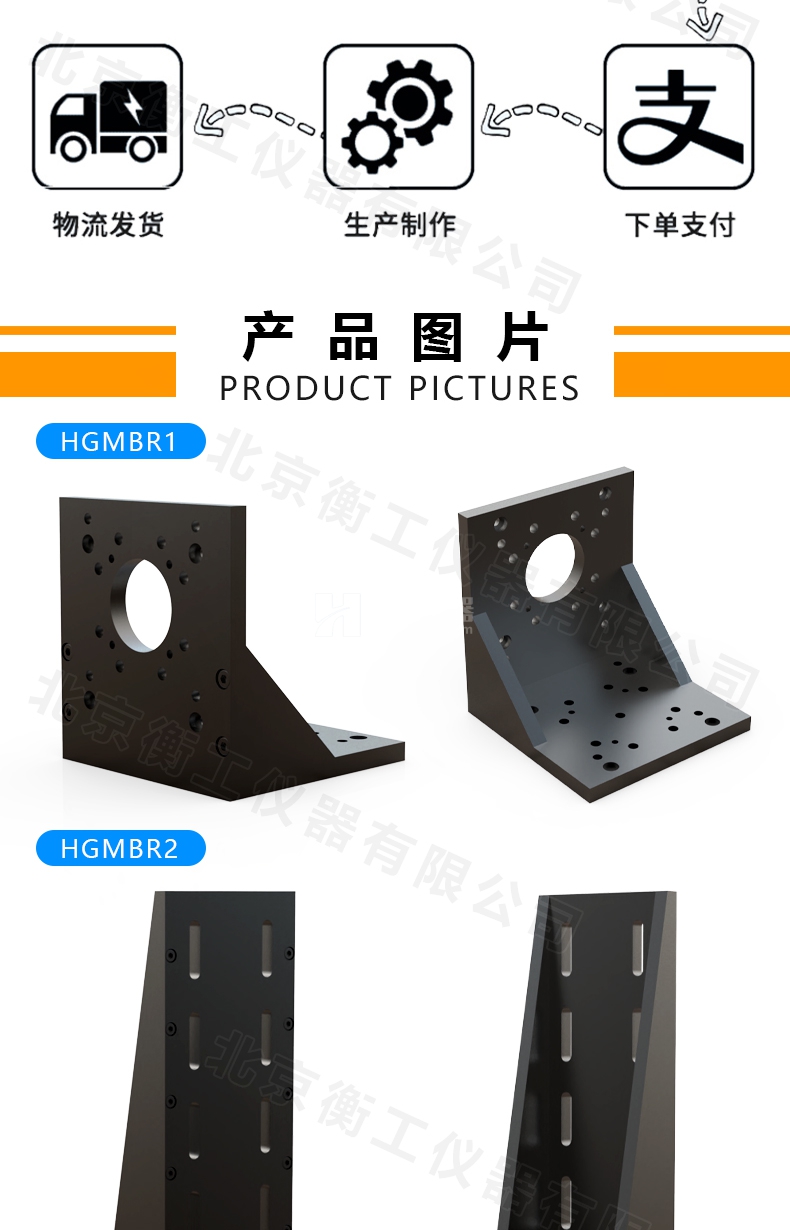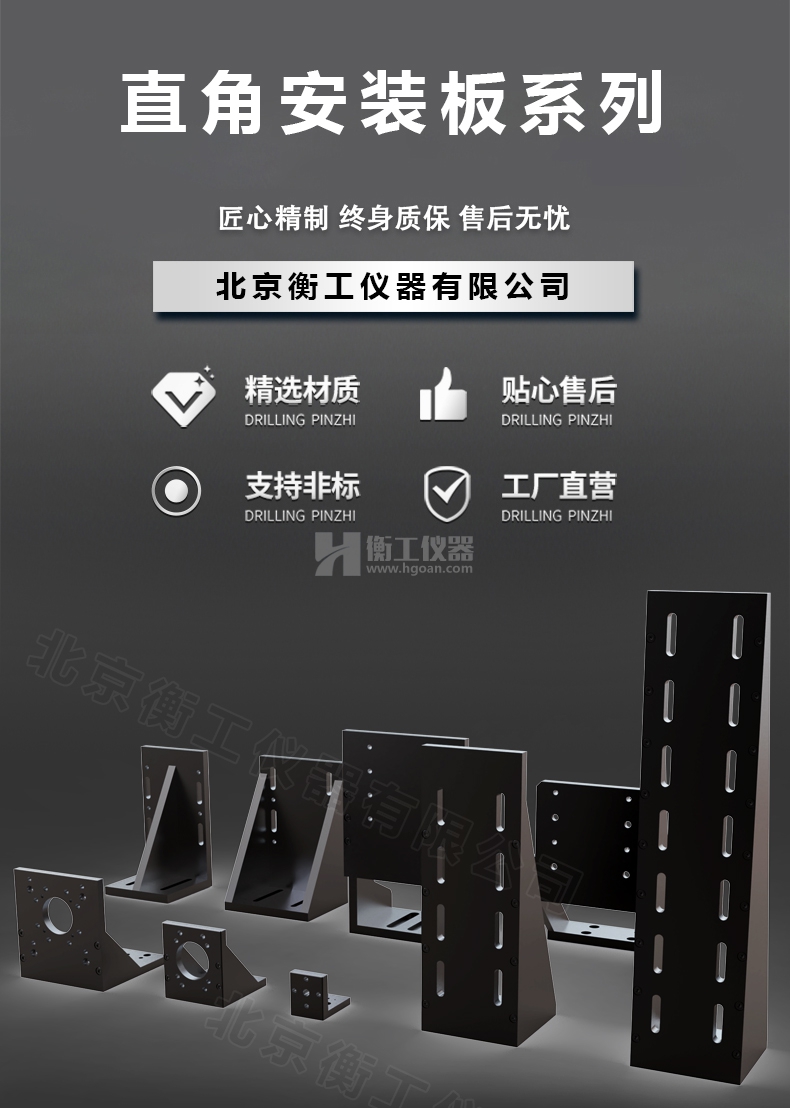 HGMBR系列直角安裝板特點(diǎn):主要用于將位移臺(tái)組合成兩維或三維正交系統(tǒng),也可將其它調(diào)整架正交組合,兩正交面精密加工,保證垂直度要求,多種安裝孔位設(shè)計(jì)通用性強(qiáng)。