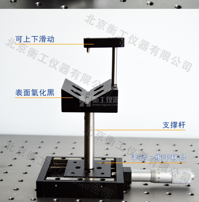 1160v型鏡架可配我司支撐桿、位移臺(tái)等使用,表面氧化黑處理,配合手動(dòng)一維平移臺(tái)。
