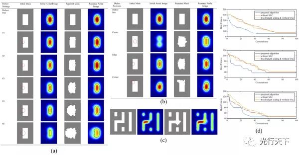 圖2. (a)對不同大小的基板缺陷的補(bǔ)償仿真結(jié)果 (b) 對不同位置的基板缺陷的補(bǔ)償仿真結(jié)果 (c) 對復(fù)雜圖形的基板缺陷的補(bǔ)償仿真結(jié)果 (d) 對不同位置的基板缺陷的補(bǔ)償、使用不同優(yōu)化算法,目標(biāo)函數(shù)收斂速度的比較
