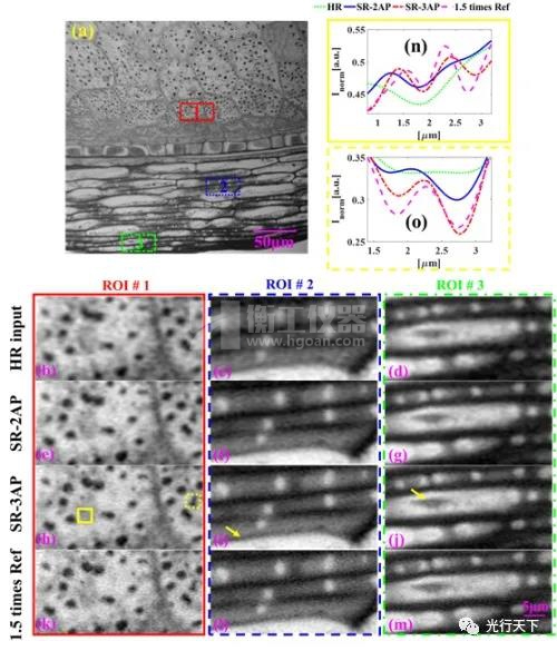 圖3.對玉米種子切片成像的對比結(jié)果。(a)3孔徑訓(xùn)練策略SR外推結(jié)果、(b)-(m)不同ROI(range of interest)的成像效果放大對比圖。(n)和(o)為兩個(gè)特征白點(diǎn)和黑點(diǎn)的橫截線對比圖。(i)和(j)中的黃色箭頭指向一些原本模糊的間隙和形狀,這些間隙和形狀通過訓(xùn)練好的dpcCARTs-NET變得更清晰