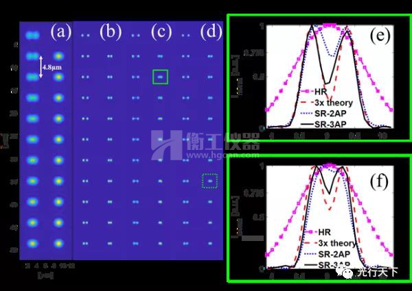 (a)衍射極限下的HR圖像、(b)3倍理論SR圖像、(c)2孔徑訓(xùn)練策略SR外推結(jié)果、(d)3孔徑訓(xùn)練策略SR外推結(jié)果、(e)和(f)為相應(yīng)的2.2倍和2.7倍SR時(shí)的橫截線對比圖。0.735為Rayleigh criterion下歸一化鞍點(diǎn)強(qiáng)度